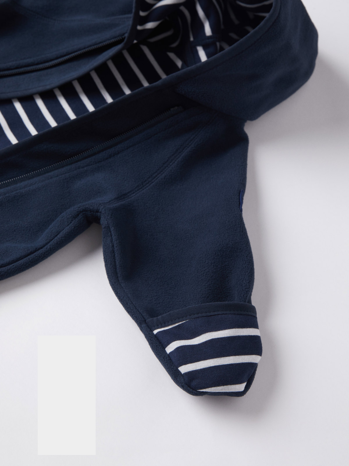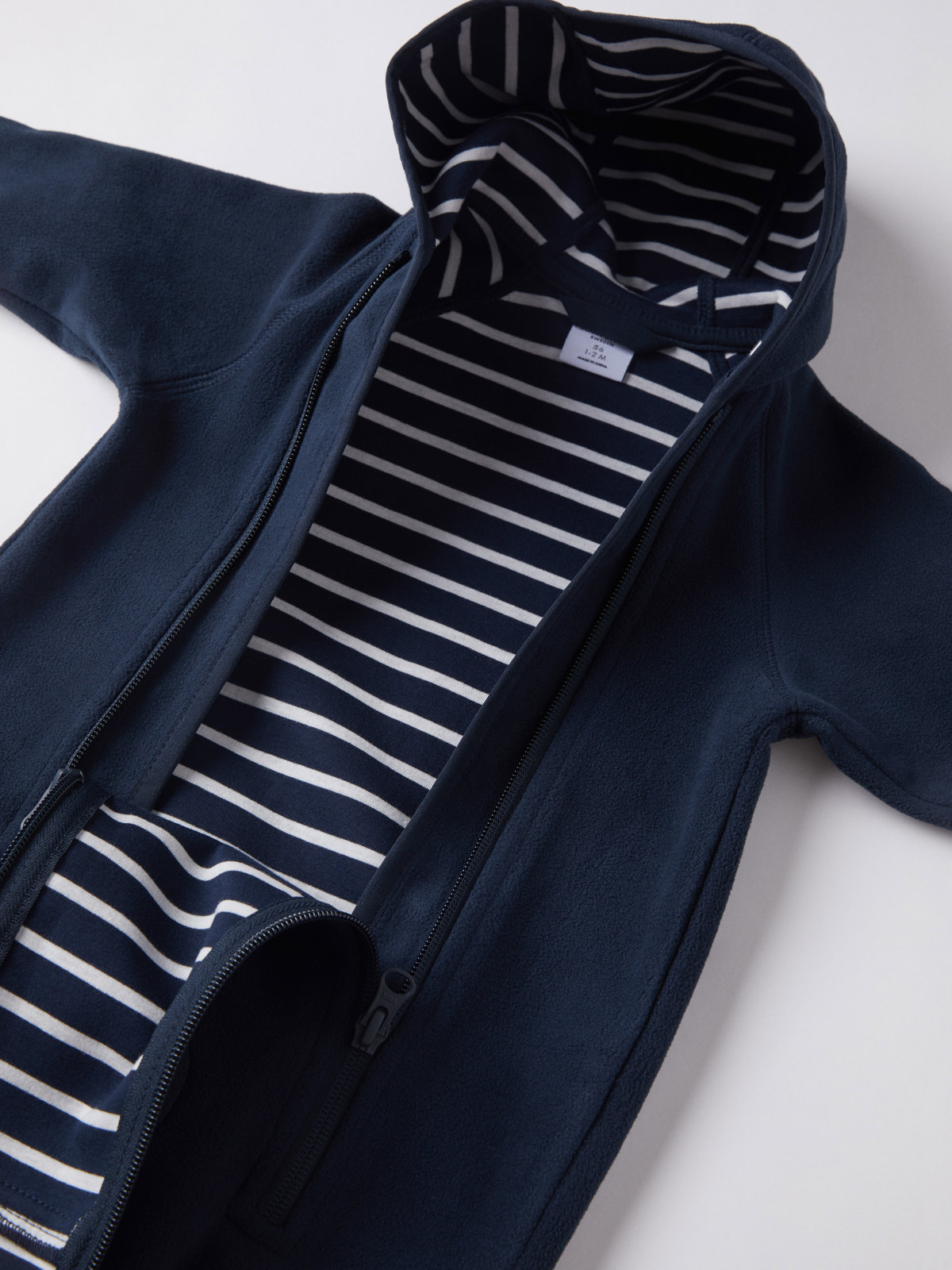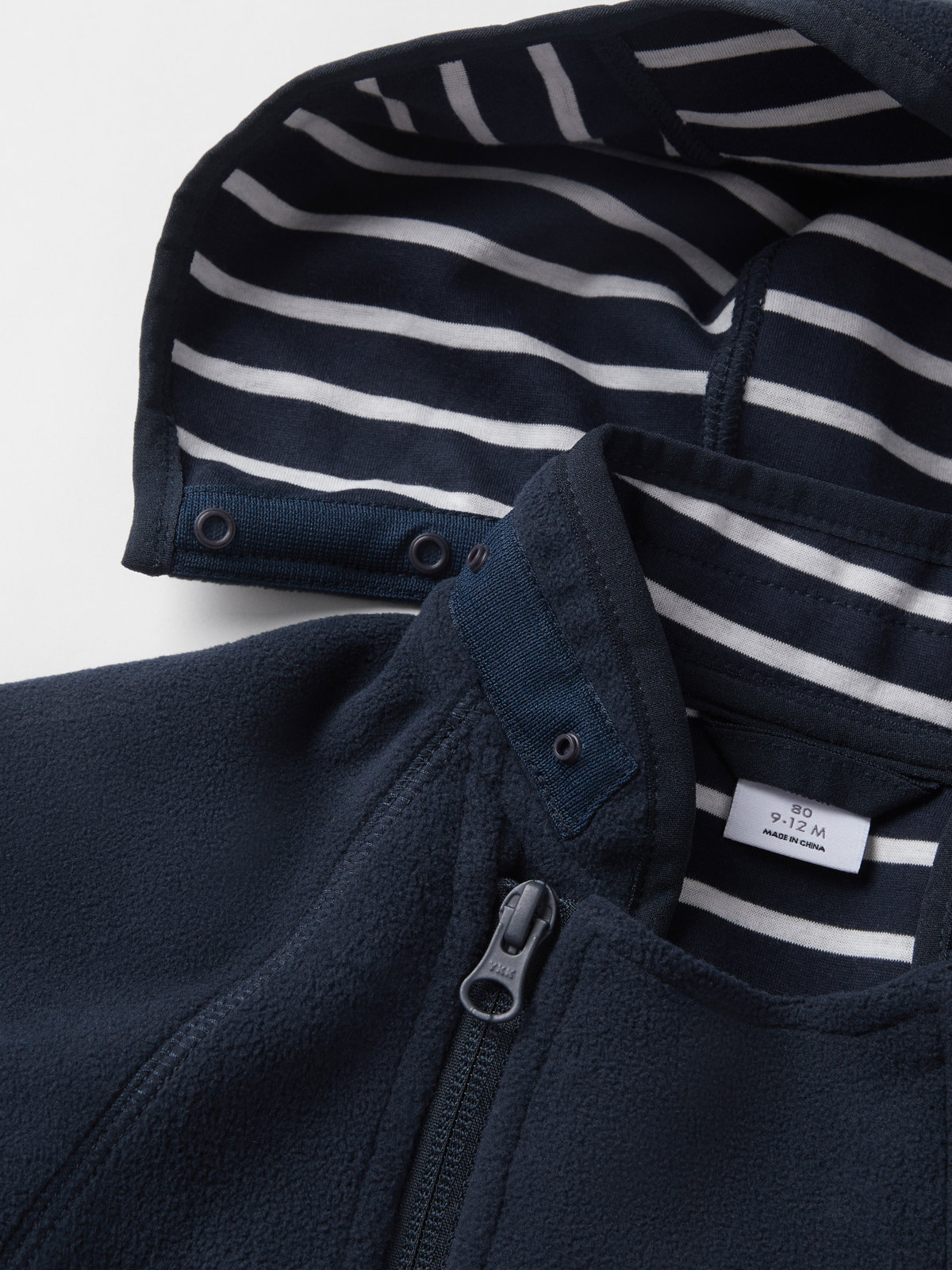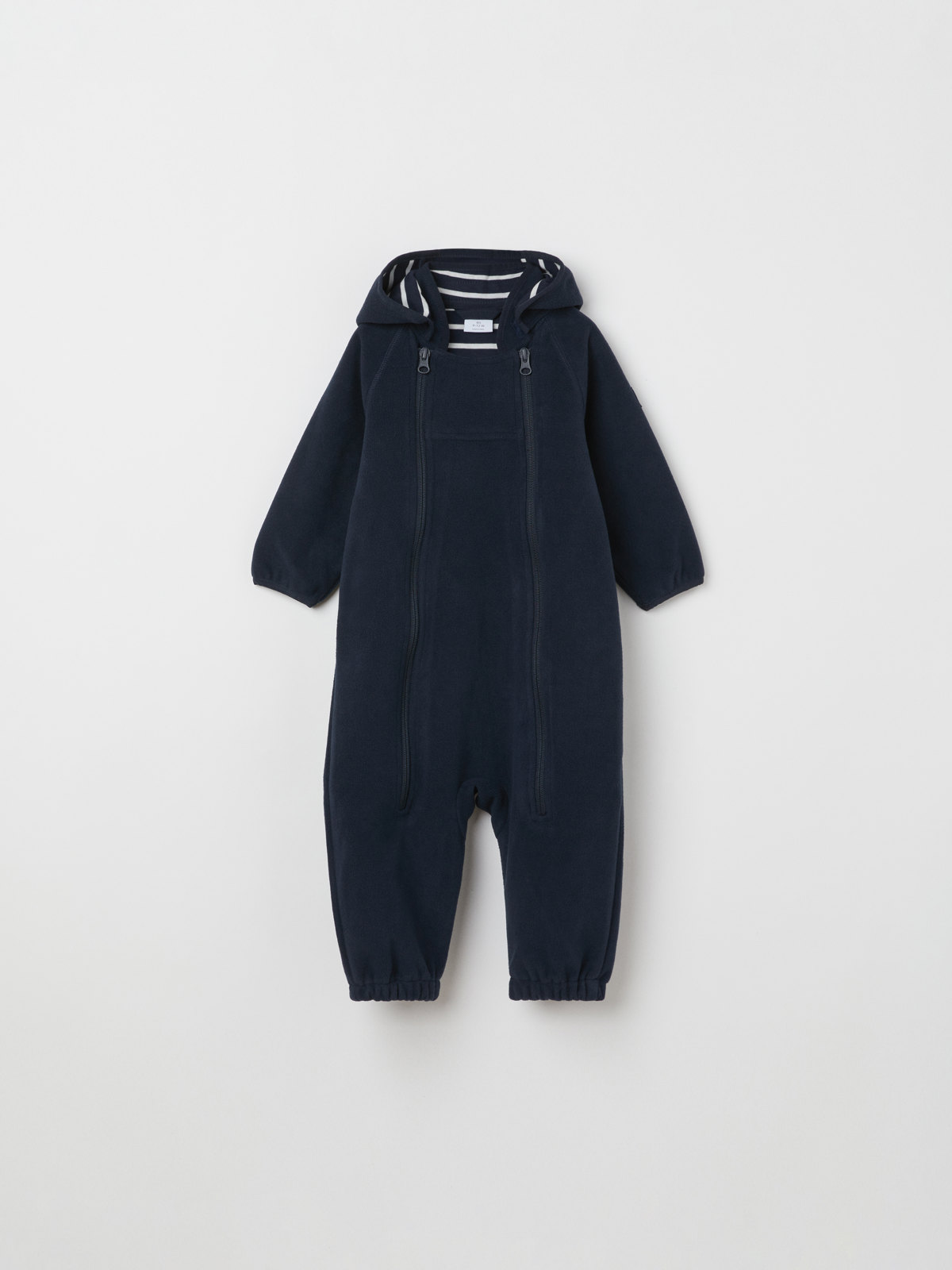 Haalari on valmistettu kierrätetystä polyesteristä, joka hengittää hyvin. Vuori pehmeää 100 % luomupuuvillatrikoota klassisella raitakuosillamme. Huppu ja edessä kaksi vetoketjua, jotka helpottavat pukemista. Vetoketjujen sisäpuolella on tuulisuoja, joka antaa lisäsuojaa kylmyyttä vastaan. Kauluksessa on suoja, jotta vetoketju ei hankaa leukaa ja poskia.