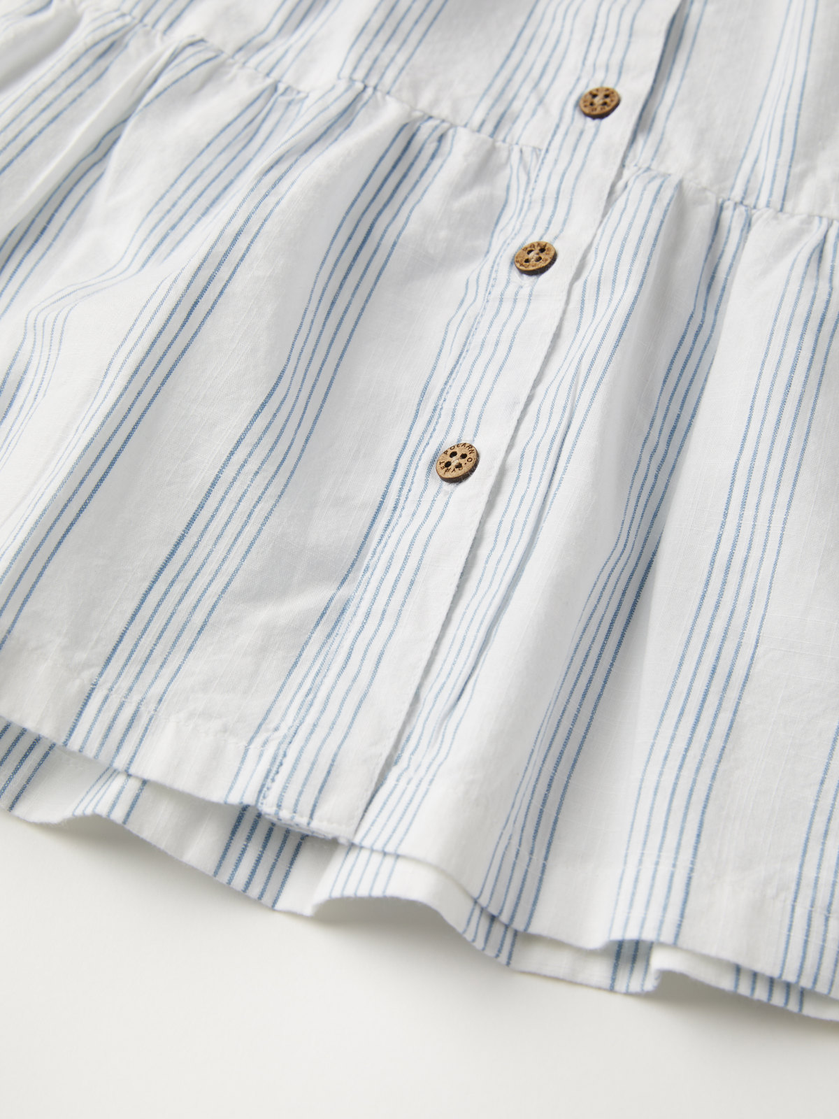 Raidallinen mekko, jossa on rypytetty hameosa. Edessä napit.