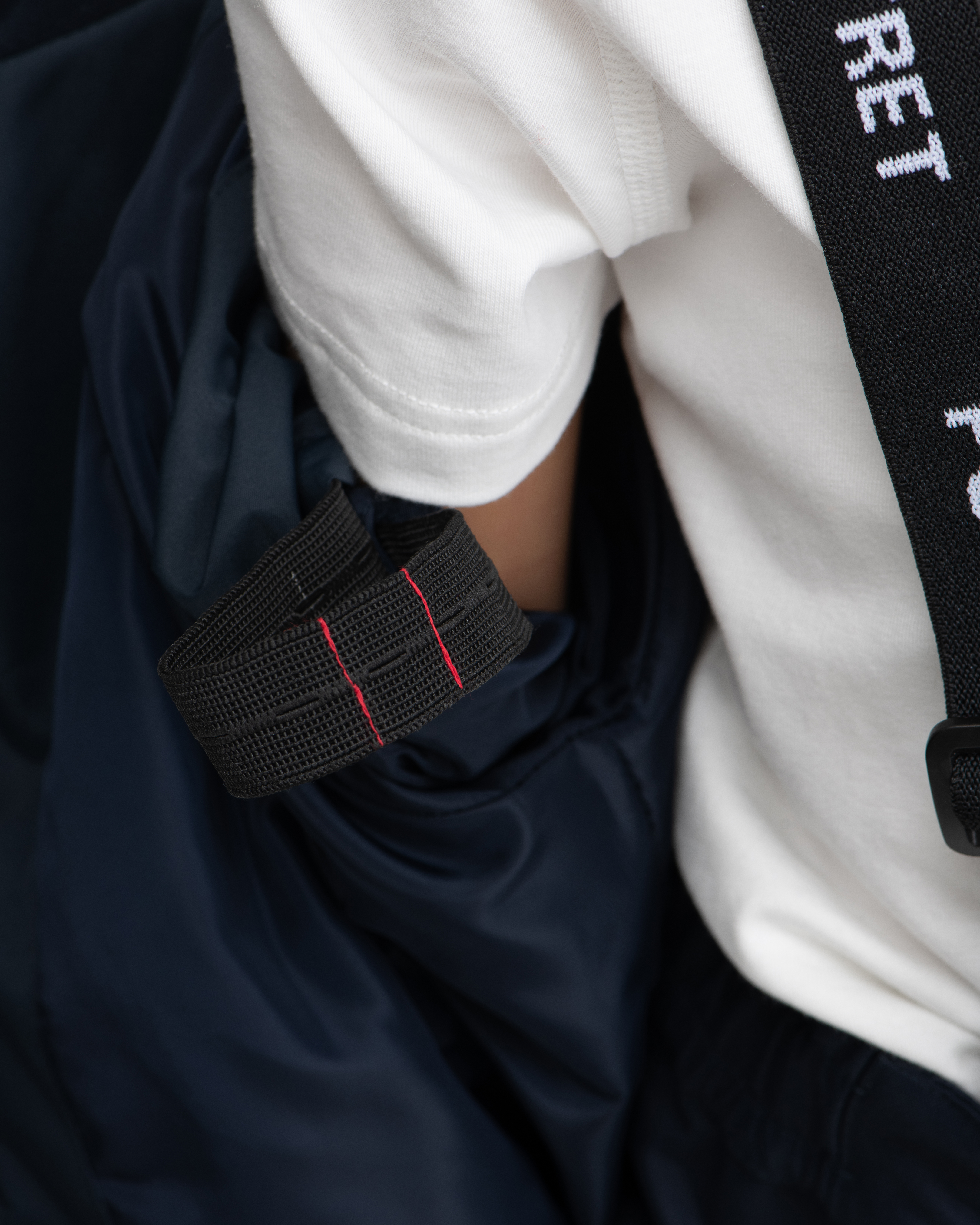 - Säätönauhat on piilotettu hihojen ja lahkeiden sisäpuolella oleviin pieniin taskuihin, jotta lapsi ei jää niihin kiinni vaatteen pukemisen ja riisumisen yhteydessä.