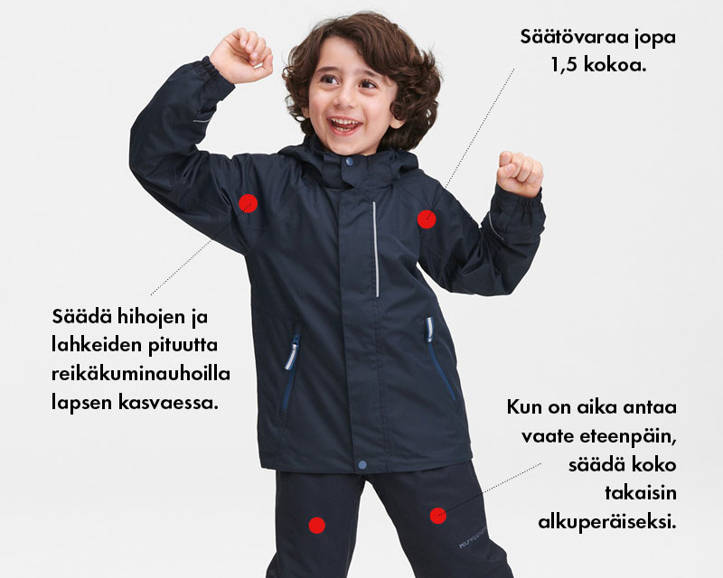 - Vaatteessa on useita säätömahdollisuuksia, joiden ansiosta vaate voi kasvaa lapsen mukana. Näin voidaan välttää liian ison vaatteen käyttö tai vaatteen tarpeeton kuluminen.